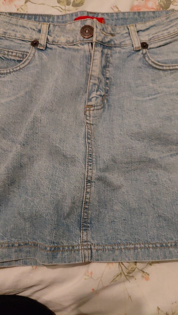 Kadınlar için düğmeli, bol kesim midi uzunluğunda gri-bej renkte düz kot etek. Günlük rahat kullanım için uygundur.