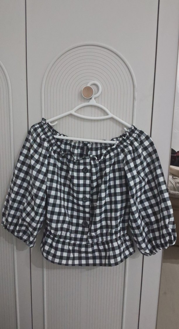 Düğmeli, askılı kollu, bol kesim ve kayık yaka kadın bluz. Yumuşak pamuktan, gri beyaz kareli desende, trend sokak stili için uygun. 1 kere giyildi