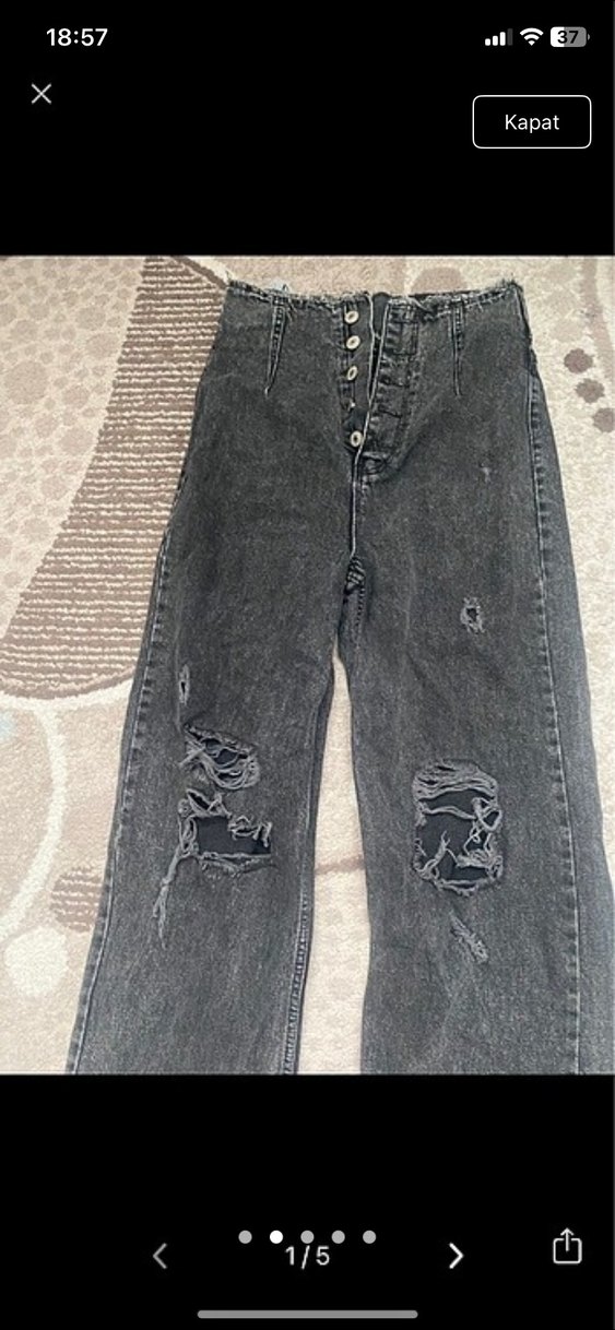 Düğmeli kapama ve yırtık detaylara sahip bol kesim gri kot pantolon. Uzun boy ve desen içermeyen tasarım, grunge punk tarzı için uygundur.teklif yollarsanız kabul ederim