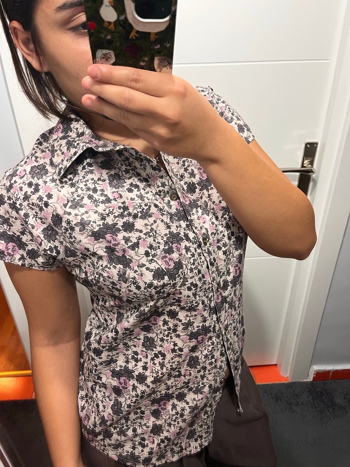 Kısa kollu, yakalı ve düğmeli, çiçek desenli gri kadın gömlek. Yumuşak sentetik kumaştan, dar kesim ve günlük kullanıma uygun.
