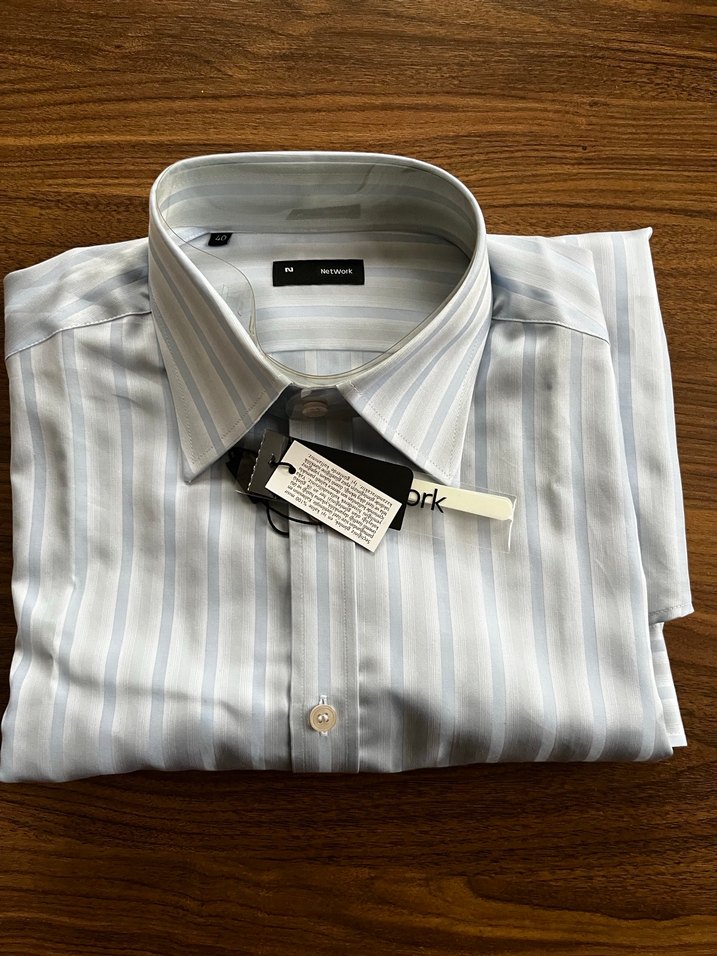 Düğmeli ön ve yakalı, kısa kollu erkek gömleği. İnce çizgili desenli, ipeksi kumaştan, ofis kullanımı için uygun.