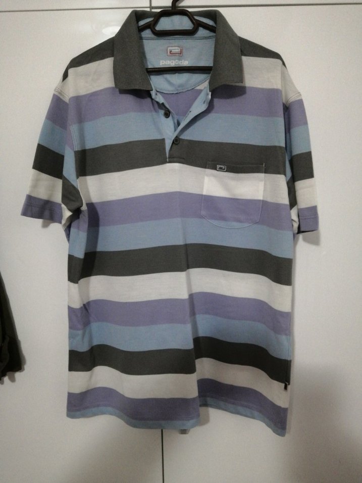 Düğmeli, yakalı ve kısa kollu erkek polo tişörtü. Gri, mavi ve beyaz tonlarında çizgili desenli, cep detaylı ve bol kesim. Sentetik kumaştan, günlük sokak stili için uygun.