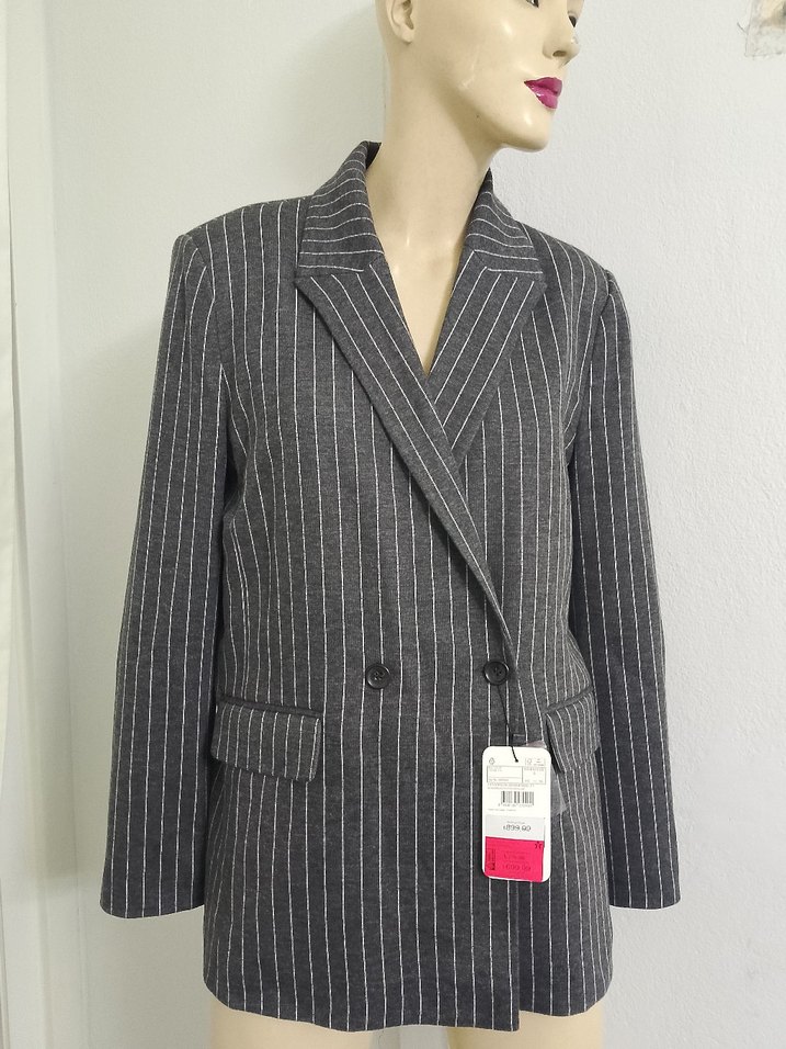 Düğmeli ön kısmı, notlu yakası ve uzun kollu gri çizgili blazer. Yün kumaştan, midi boy ve normal kesimdir. Ofis kullanımı için uygundur. s beden fakat l bedene kadar olur on düğmeler ayarlanir