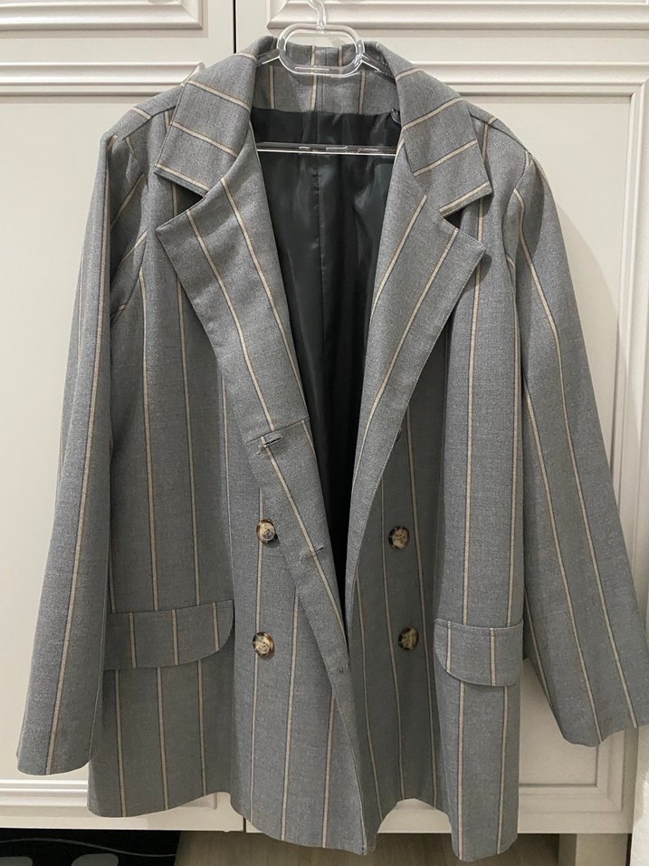 Düğmeli ve çizgili gri kadın blazer ceket, normal kesim ve midi boyda, uzun kollu ve sentetik kumaştan üretilmiştir. Ofis ve günlük kullanıma uygundur. Ölçüm olmadığı için ölçemiyorum. 162 boyundayım, benim kalçamı kapatıyor giydiğimde. ÖZEL DİKİMDİR. M-L bedene uygundur.