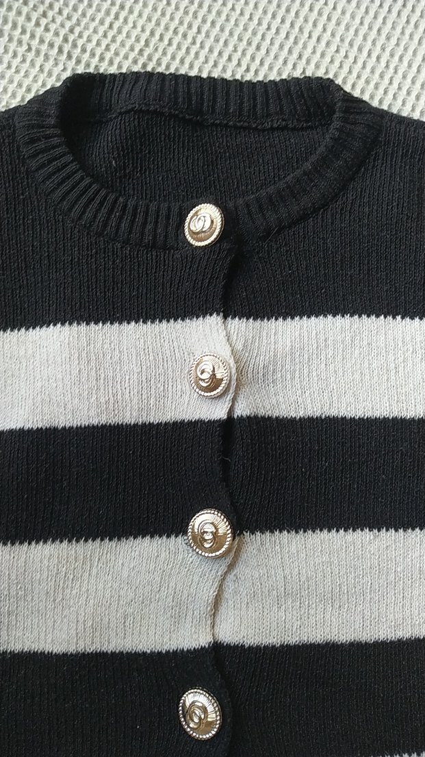 Düğmeli, uzun kollu ve bisiklet yaka krem siyah çizgili kadın hırka, rahat kesim ve triko kumaştan, günlük kullanıma uygun.