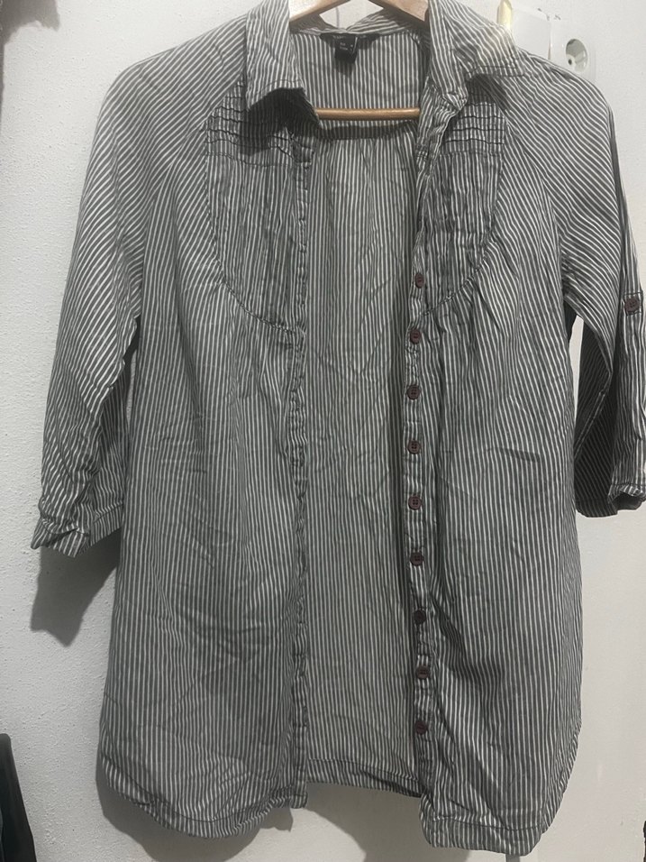 Düğmeli Gri Çizgili Kadın Keten Gömlek