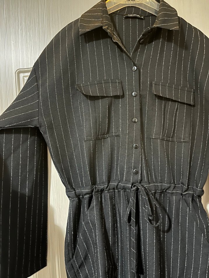 Düğmeli Gri Çizgili Kadın Tulum