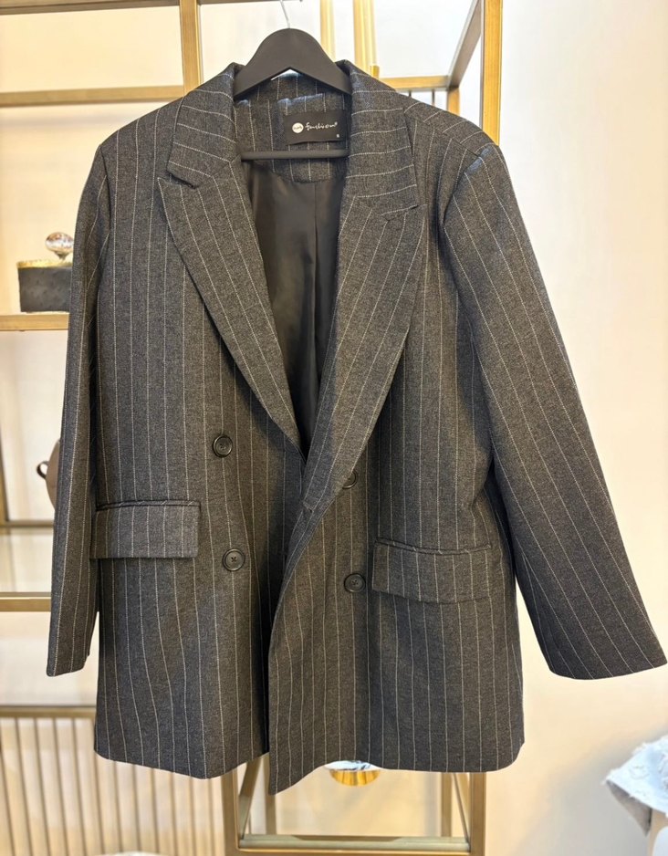 Düğmeli Gri Çizgili Oversize Kadın Blazer