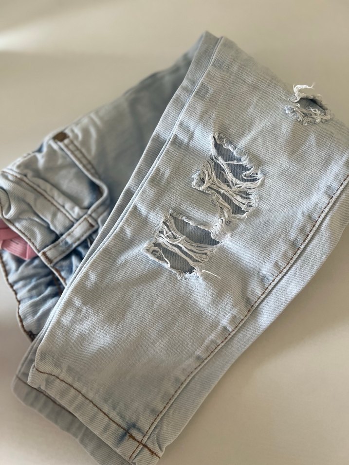 Düğmeli ve yırtık detaylı gri fitted denim pantolon, günlük sokak stili için uygundur.