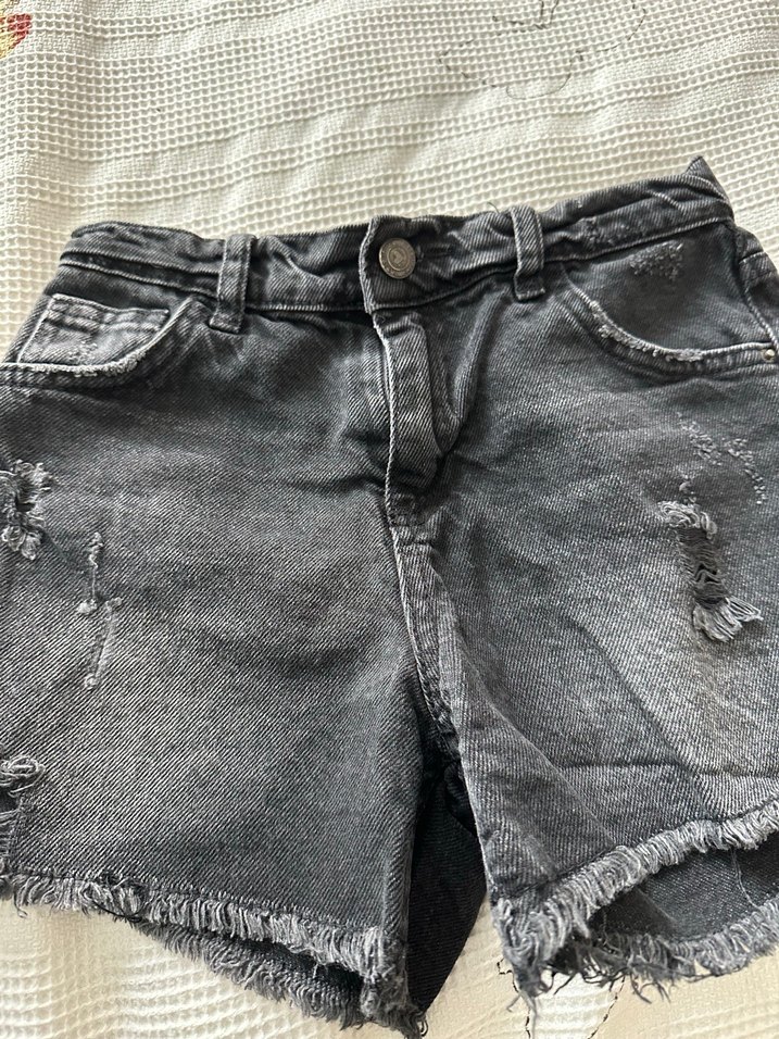 Düğmeli, bol kesim gri denim mini şort. Yıpranmış detaylara sahip, kısa boylu ve rahat sokak stili, günlük kullanım için uygundur.