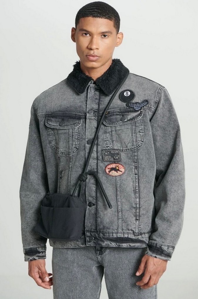 Düğmeli, gri denim erkek ceketi, notlu yaka ve uzun kollu. Bağlama deseni ve günlük kullanım için regular fit özelliklidir.