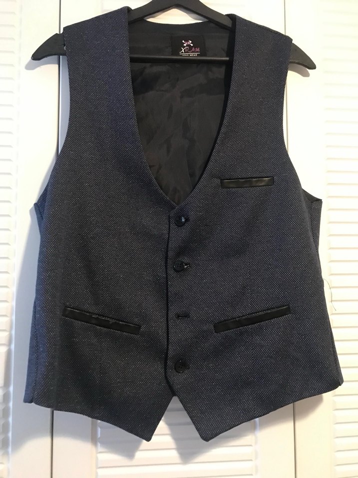 Gri denim kumaştan, düğmeli ve kesik yaka detaylı erkek yelek. Kolsuz, normal boy ve rahat kesim ile ofis kullanımı için uygundur.