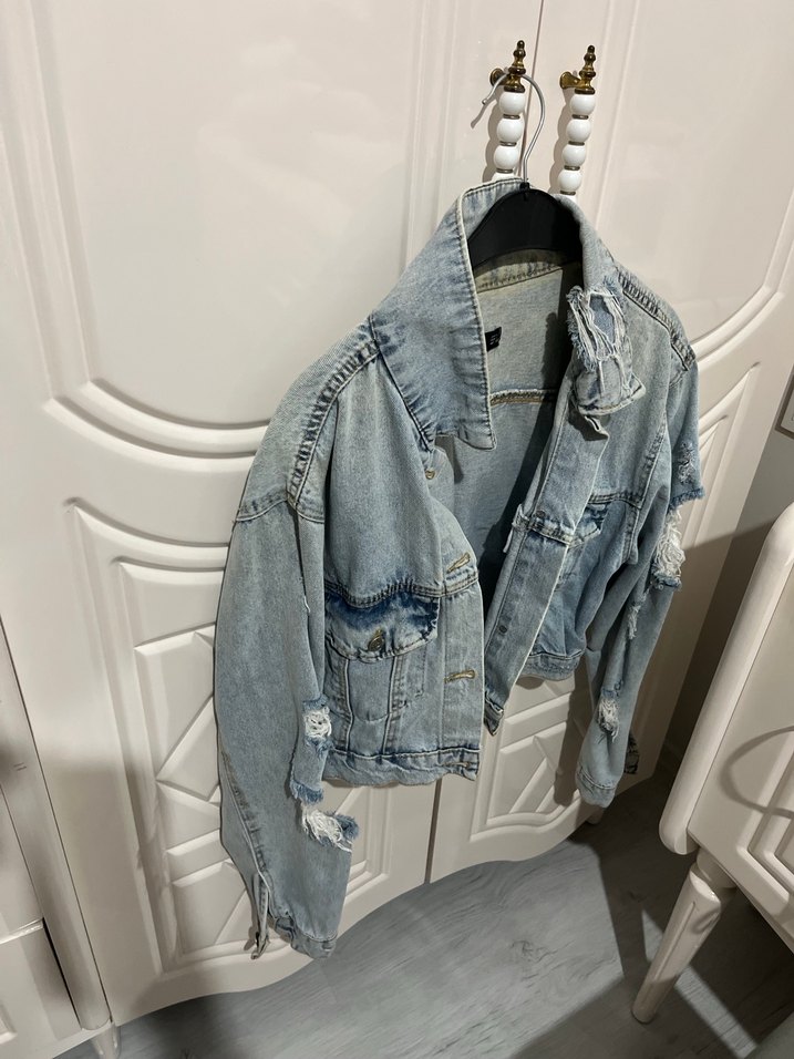 Düğmeli, yırtık detaylı, bol kesim gri denim ceket. Askılı kollar ve çentikli yaka ile günlük sokak tarzına uygun.