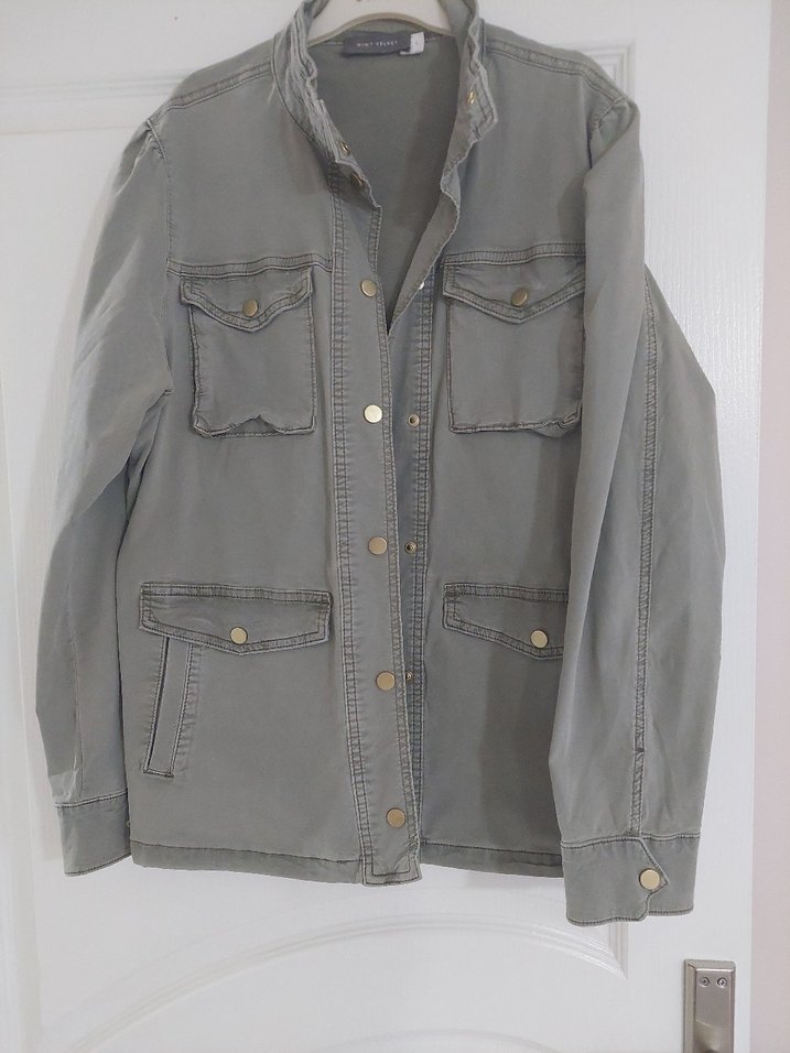 Gri renkli, düğmeli, cep detaylı, notched lapel yakalı, bol kesim denim kadın ceket. Günlük kullanım için uygundur.