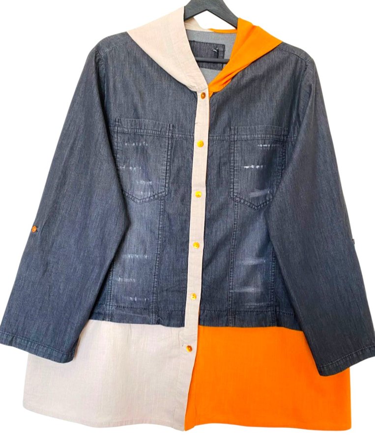 Gri, bej ve turuncu renk bloklu, düğmeli, uzun kollu, notched lapel yakalı, bol kesim kadın denim ceketi.