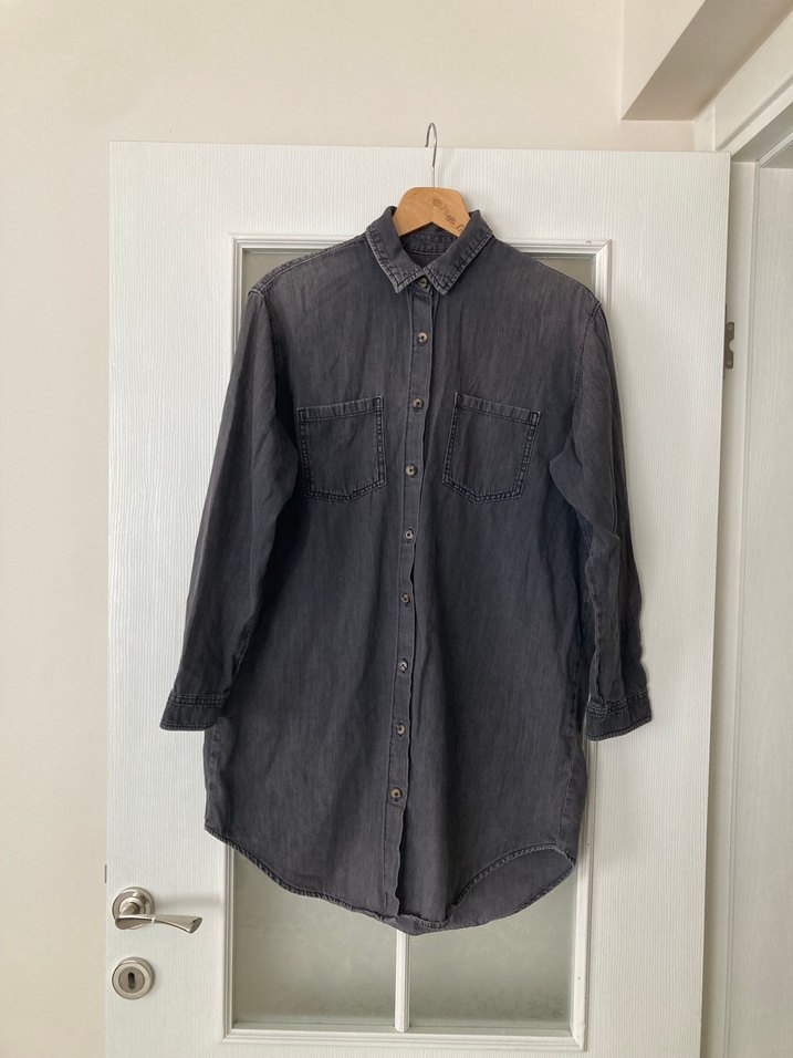 Gri denim kadın gömlek, düğmeli ve yakalıdır. Uzun kollu, bol kesim ve midi boyda, rahat günlük kullanım için uygundur.