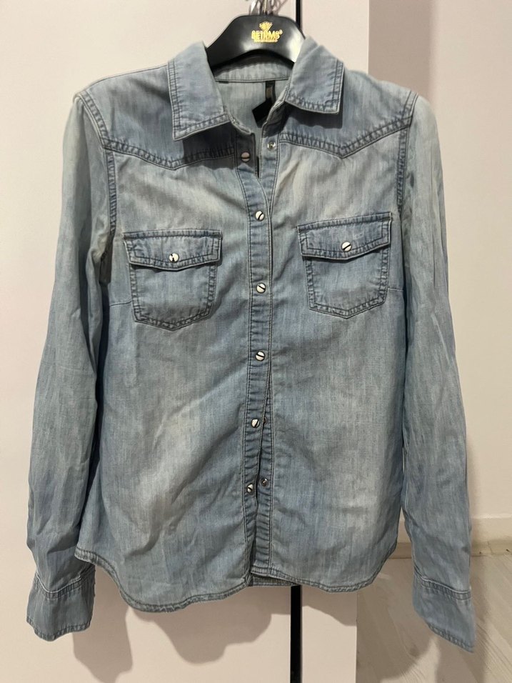 Düğmeli ön, uzun kollu ve yakası kesik detaylı denim kadın gömlek. Rahat kesim açık mavi renkte, günlük sokak stili için uygun.