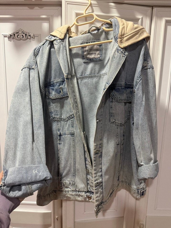 Uzun kollu, düğmeli gri denim ceket, bej kapüşonlu ve kesik yakalı, rahat ve salaş kesimle günlük sokak stili için uygun. büyük geldiği için satıyorum hiçbir sorunu yok