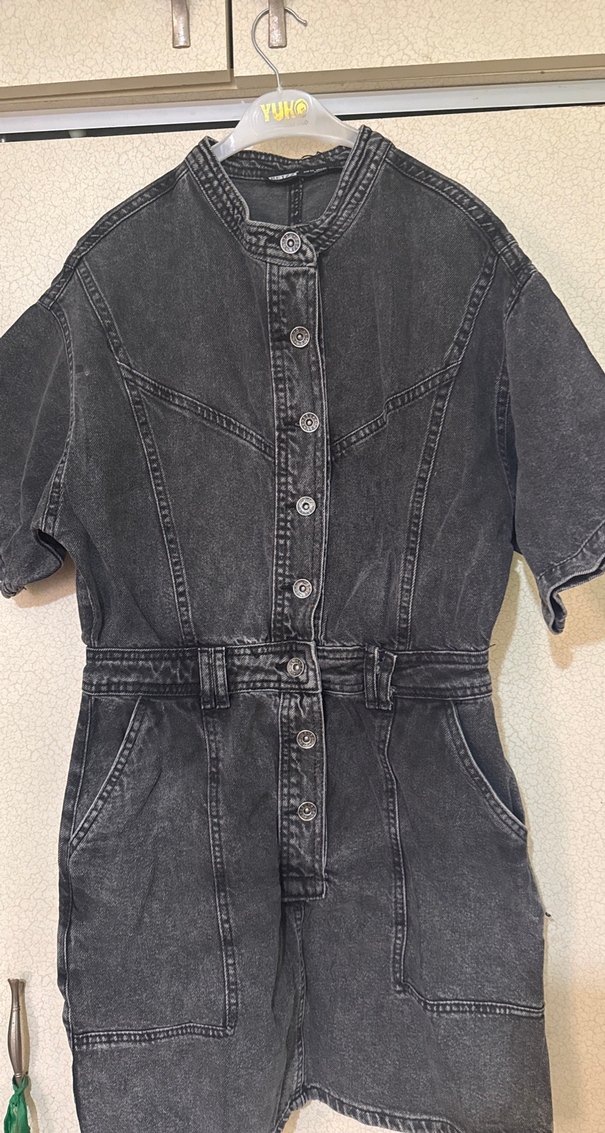 Düğmeli, yüksek yakalı, kısa kollu ve gri denimden yapılmış, sokak stilinde, günlük kullanıma uygun dar kesim tulum.