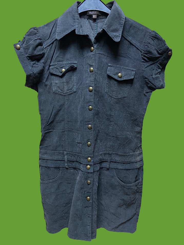 Düğmeli, kısa kabarık kollu, gri denim midi elbise. Notlu yakası ve cep detaylarıyla şık ve rahat bir sokak stili elbisesi. alttan nir dugmesi eksiktir