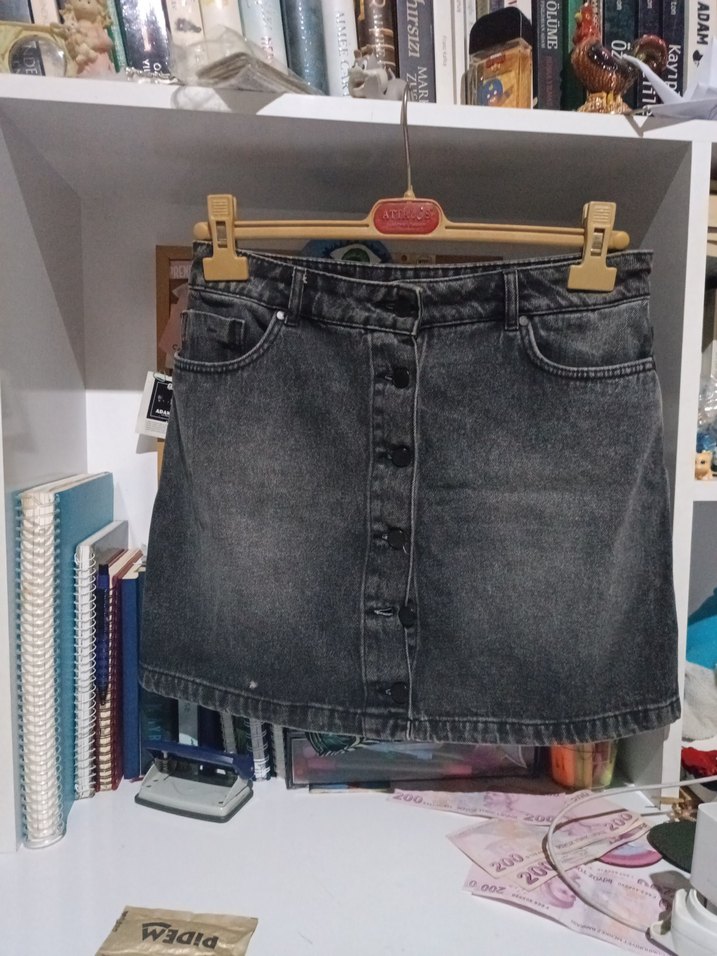 Gri denim midi etek, düğmeli ve bol kesim, günlük kullanıma uygun rahat tie-dye desenli.