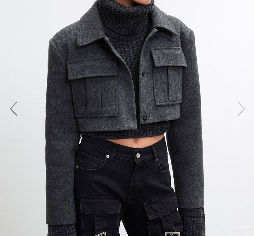 Gri denim kumaştan üretilmiş, düğmeli ve notched yakalı midi uzunlukta kadın ceket. Uzun kollu ve rahat kesimdir, günlük sokak stili için uygundur.