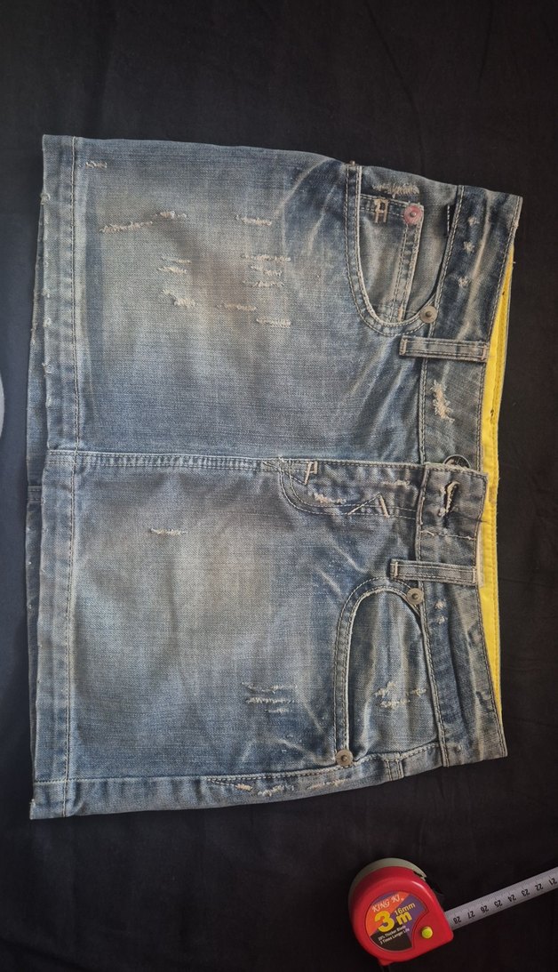 Düğmeli, bol kesim gri denim mini etek, hafif yıpranmış görünümü ve sarı iç astarıyla günlük kullanıma uygun rahat bir stil sunar. beli 38 cm boyu 32 cm