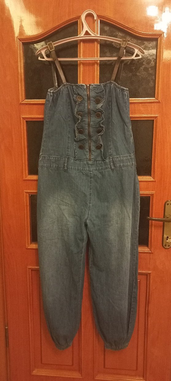 Gri denim tulum, askılı ve yakası kesik detaylıdır. Düğmeli ön kısmı, bol kesimi ve midi boyu ile gündelik kullanıma uygundur. l beden straplez deri askı detay düğme ve fırfır detay çok havalı nadir bulunan bir ürün sorunsuzdur tertemiz iki kol arası 42cm bel44cm basen 57cm boy122cm marka temsilidir