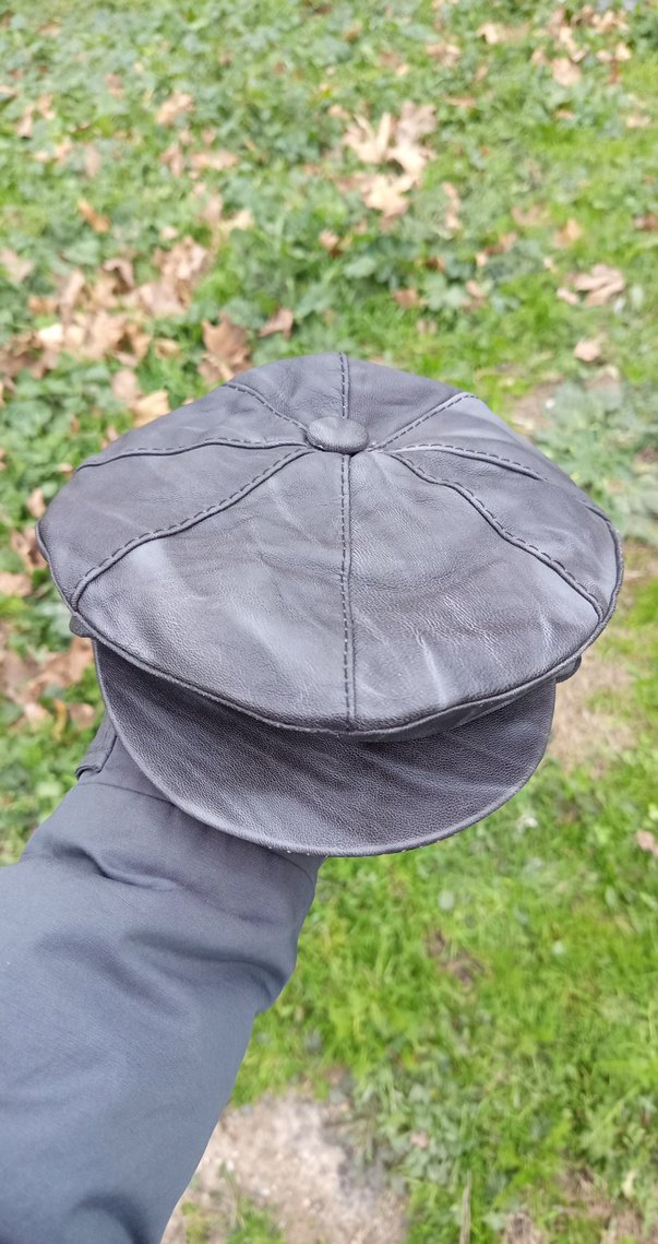 Düğmeli tasarıma sahip gri hakiki deri biker şapka, vintage sokak stilini yansıtıyor. Yumuşak deri dokusuyla klasik biker görünümü sunar.