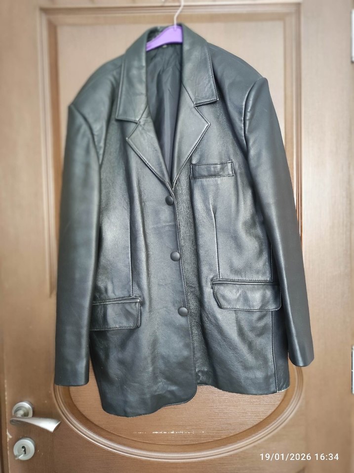 Erkek deri ceket, düğmeli ve kesimli yakalıdır. siyah renkte, uzun kollu ve normal midi boydadır. Ofis için uygun, klasik ve sokak stilini yansıtır.