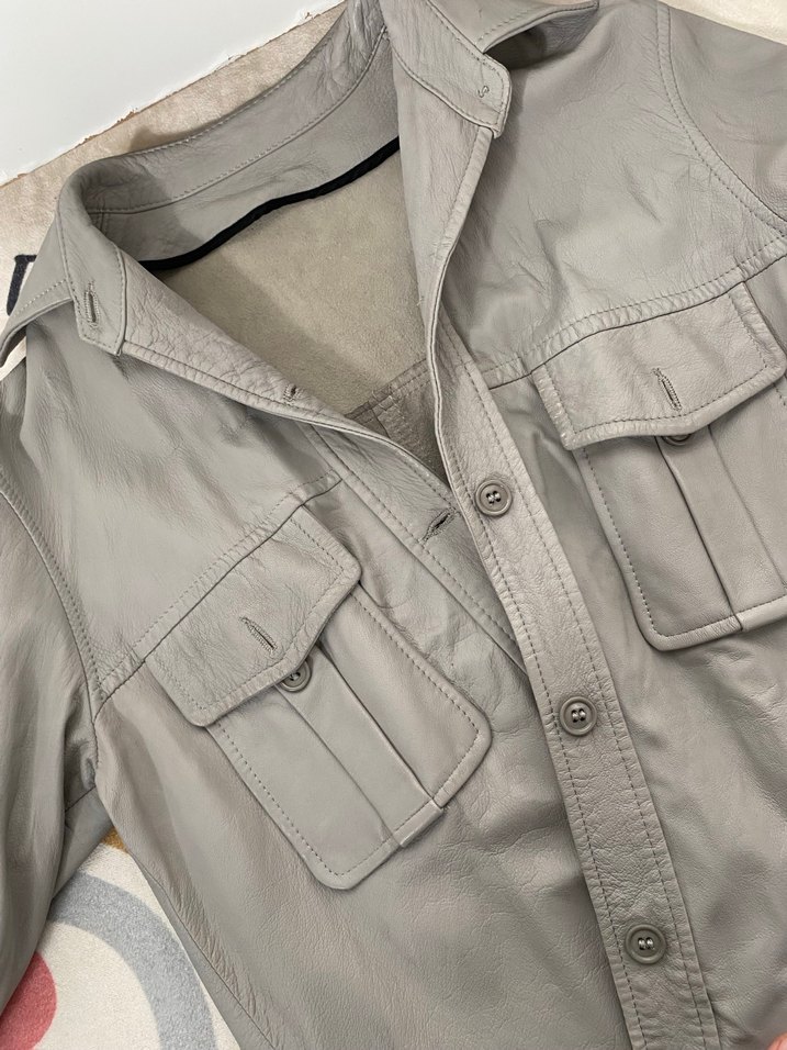 Hiç bir sorunu yok temiz defosuz ürün giymediğim için satıyorum. Sadece en altta çok minik soyulma Çar ama o soyulma modelle ilgili yani aldığımdan beri olan soyulma devam etmedi o yüzden sorun yaratacağını düşünmüyorum. Düğmeli cepleri ve yakalı tasarımıyla, gri renkli, normal midi boyda, uzun kollu, dar kesim deri kadın ceket.
