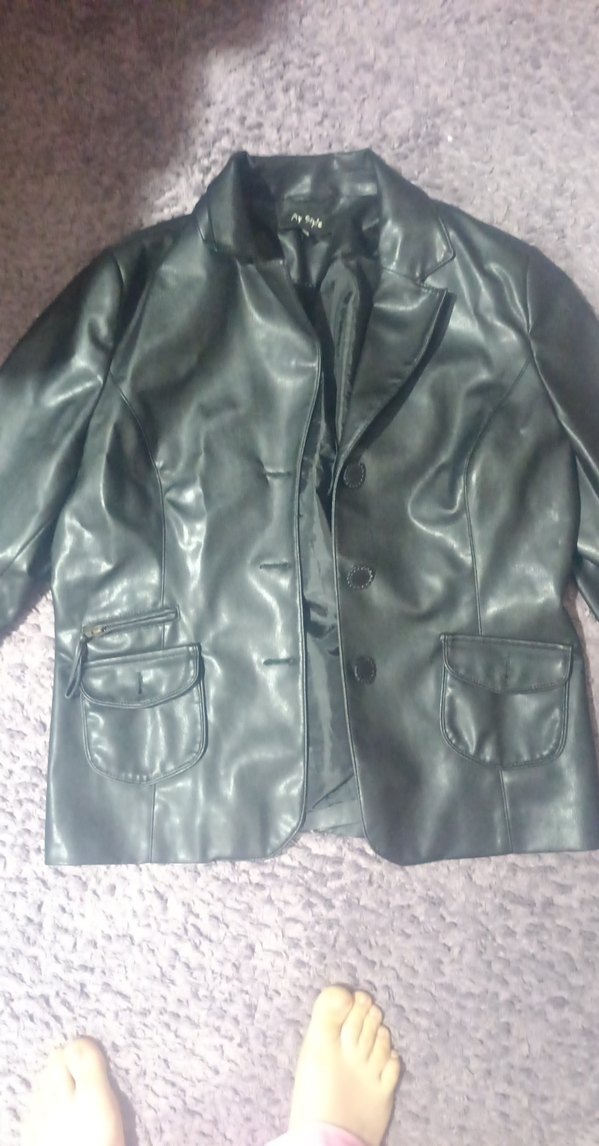 Düğmeli, gri deri, normal boy, uzun kollu, kesimi vücuda oturan, kruvaze yaka ve cepli kadın ceket. Ofis kullanımı için uygundur.