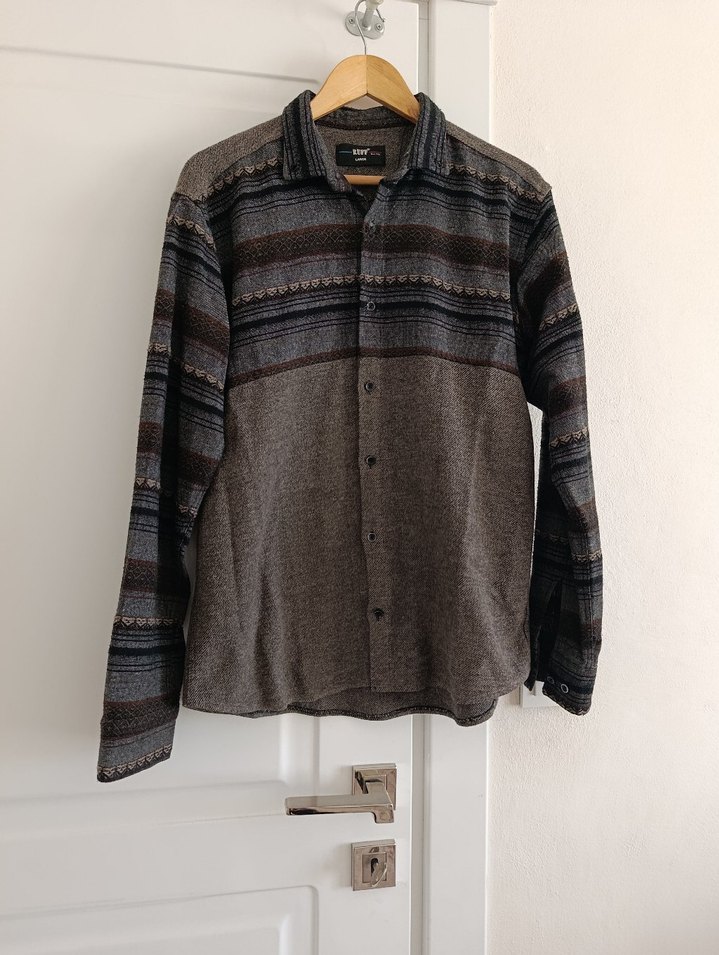 Düğmeli, yaka ve uzun kollu bu erkek gömleği yumuşak yün kumaştan üretilmiştir. Gri ve kahverengi tonlarında desenlidir, rahat kesimlidir ve günlük kullanıma uygundur.
