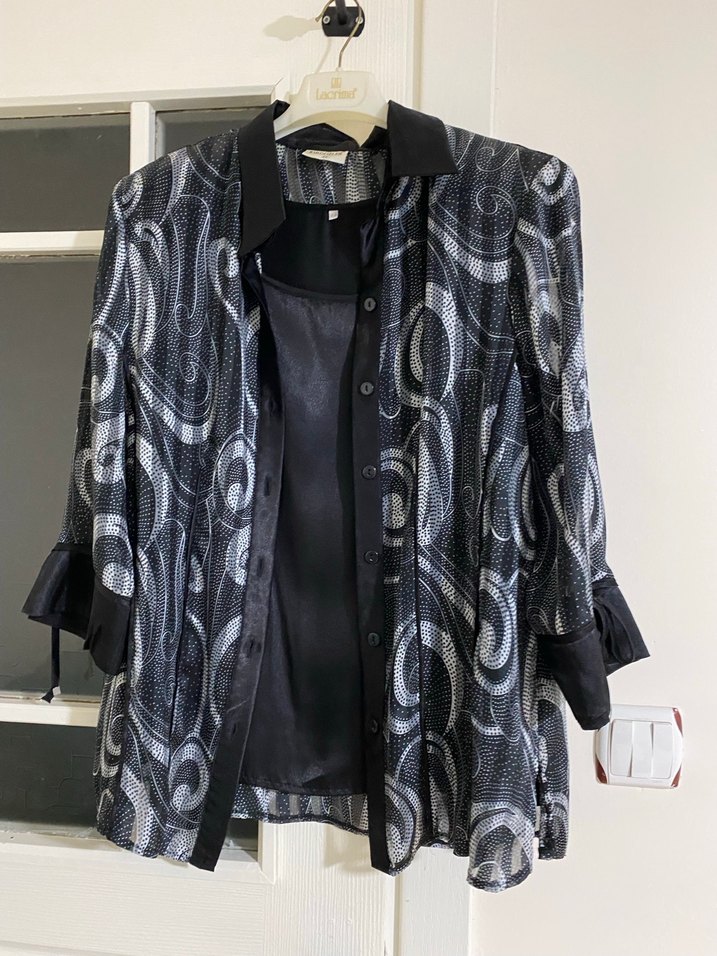 Düğmeli ön, kesik yaka ve uzun kollu, gri desenli uzun ceketi. Sentetik kumaştan, bol kesim ve ofis için uygun.