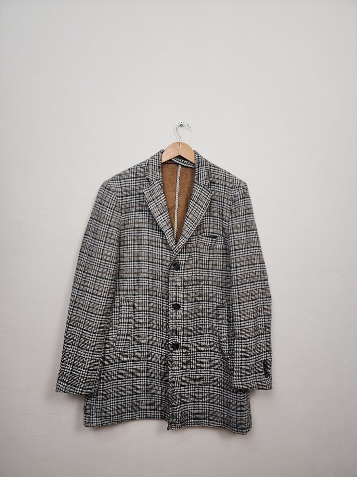Düğmeli, gri ekose desenli, yün kumaştan erkek ceketi. Normal uzunlukta, uzun kollu ve klasik kesimdir. Ofis kullanımı için uygundur.