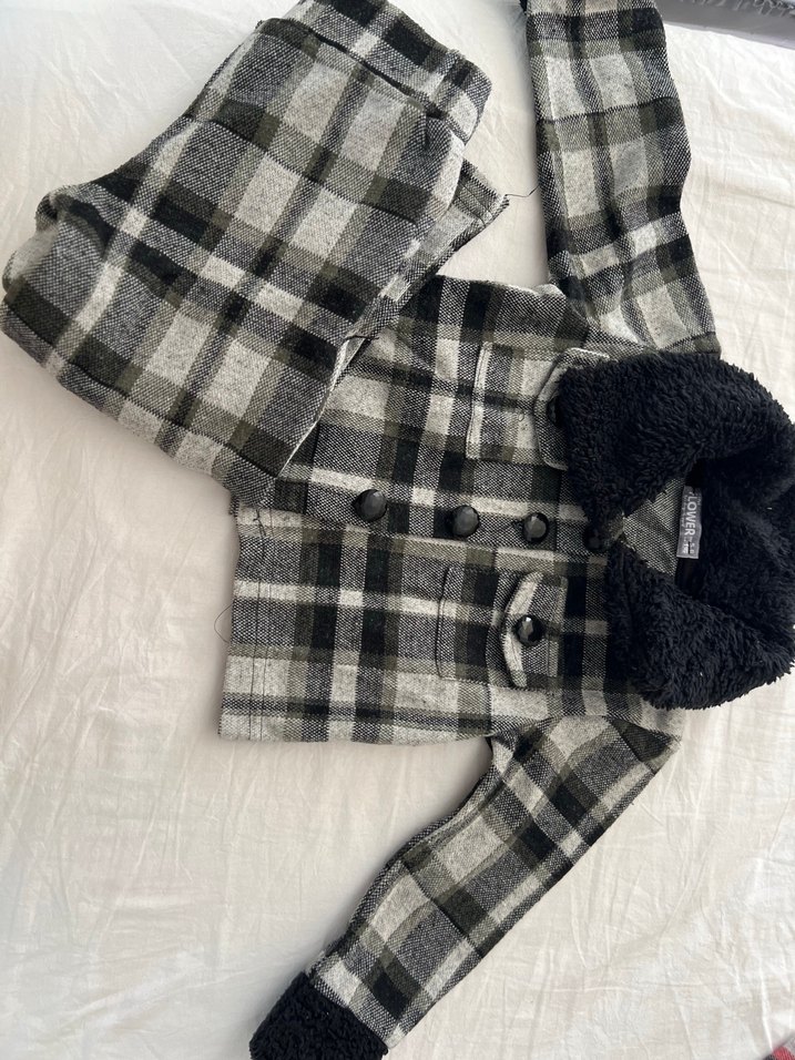 Düğmeli, yün kumaştan yapılmış, gri ekose desenli, erkek çocuklar için dar kesim kaban. Siyah dokulu manşet ve yakası bulunur.