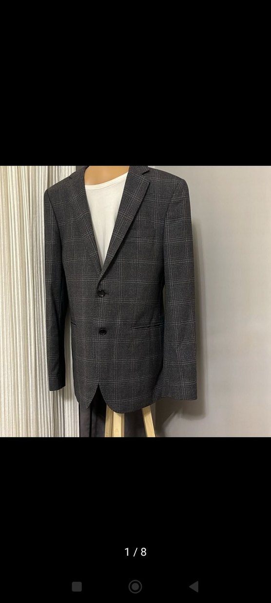 Düğmeli, uzun kollu, gri ekose desenli erkek takım ceketi. Normal kesim ve kesik yaka detaylarıyla ofis ve sokak stiline uygundur.