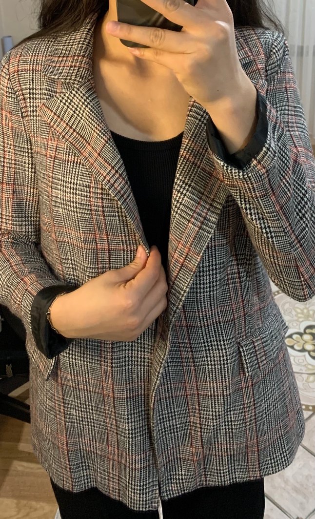 Düğmeli, gri tonlarda ekose desenli, notched lapel yakalı kadın blazer ceket. Uzun kollu, normal kesim ve midi boyda, sentetik kumaştan üretilmiştir. Business ve günlük stil için uygundur.