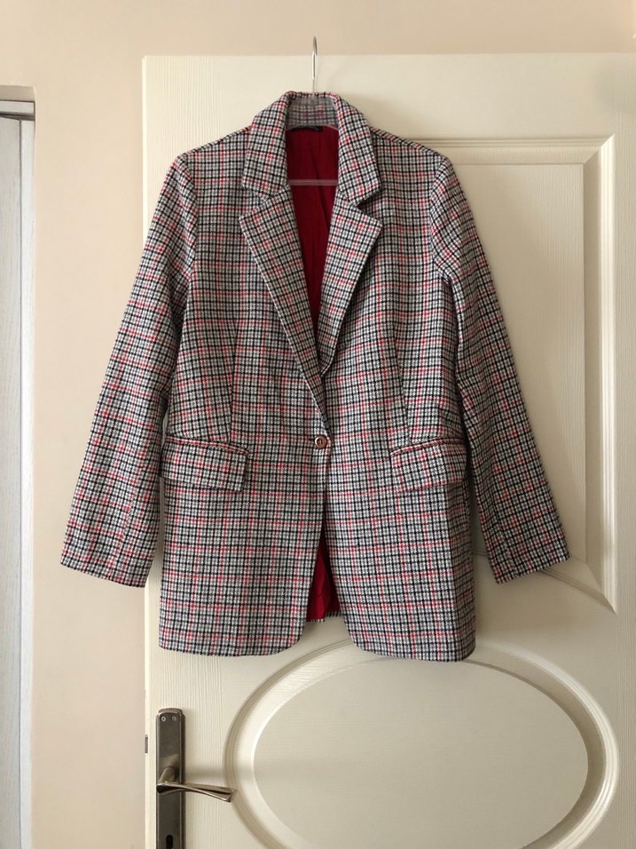 Düğmeli Gri Ekose Kadın Blazer Ceket