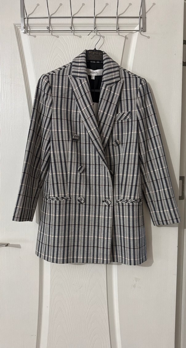 Düğmeli, gri ekose desenli kadın blazer ceket. Notlu yaka, normal kesim ve midi boy, ofis ve sokak stiline uygun. Sentetik kumaştan, trend ve rahat bir görünüm sunar.