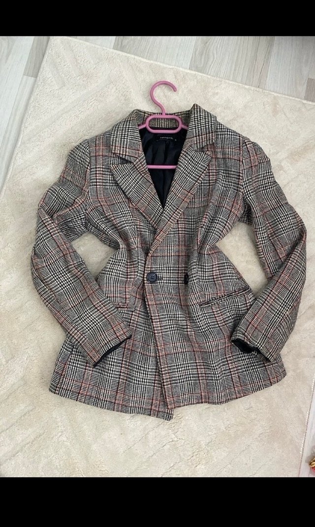 Düğmeli Gri Ekose Kadın Blazer Ceket