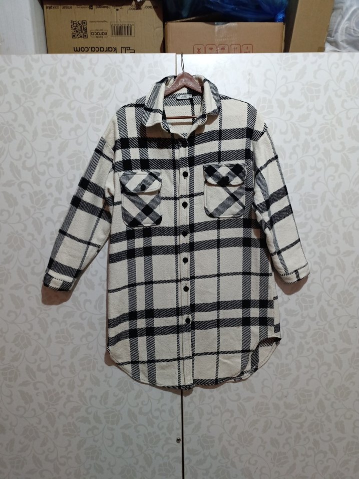 Gri ekose desenli, düğmeli, uzun kollu, rahat kesim kadın gömleği. Yumuşak ve sıcak kumaştan, günlük sokak stiline uygun.