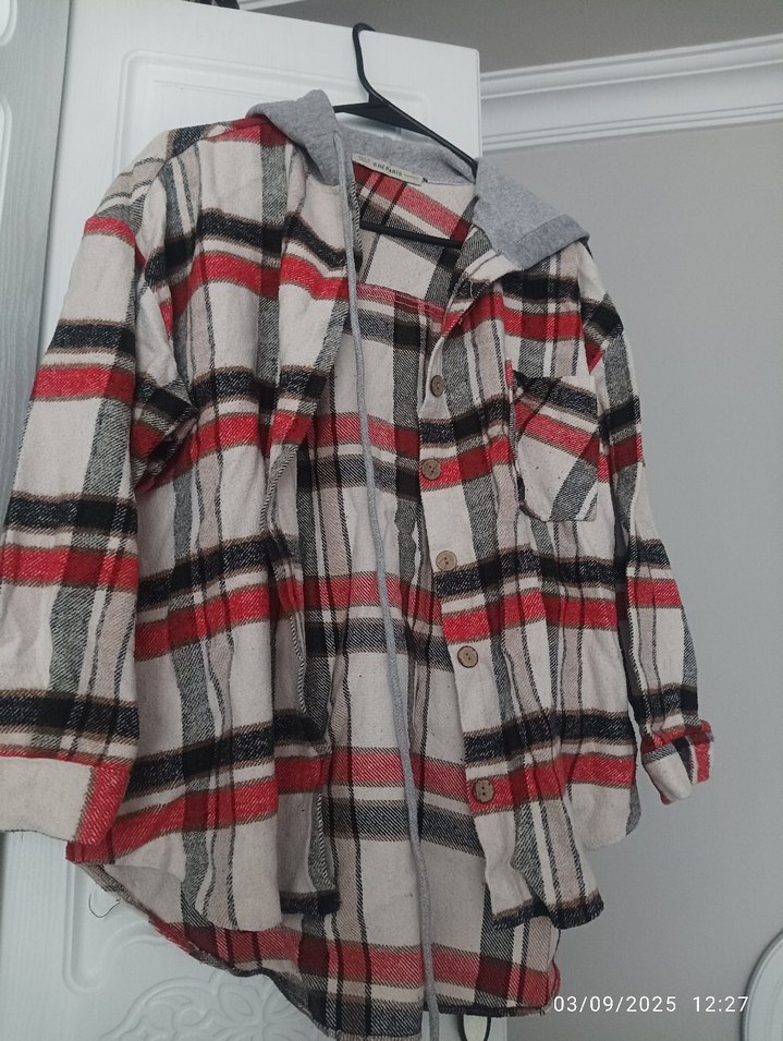 Uzun kollu, düğmeli kadın gömleği. Gri, kırmızı ve siyah ekose desenli, yumuşak kumaştan üretilmiştir. Salaş kesim ve notalı yakalı, günlük rahat stil için uygundur.