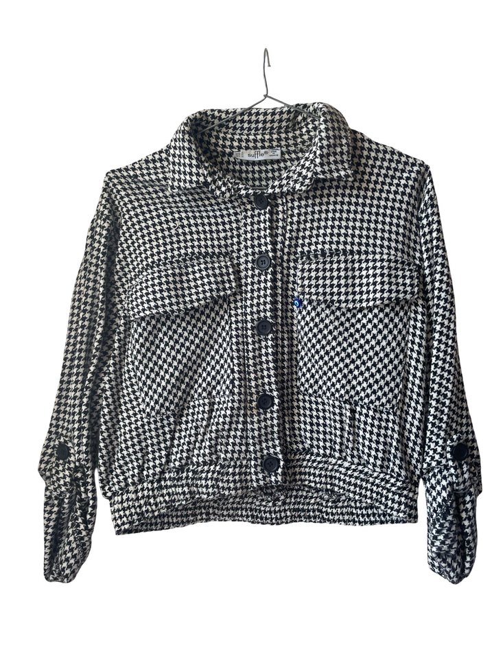 Gri ekose desenli, düğmeli, kısa uzunlukta ve bol kesim kadın gömlek. Notlu yaka ve uzun kollu, günlük sokak stiline uygun rahat bir parça.