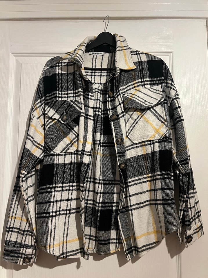 Düğmeli, uzun kollu, geniş kesim ve notalı yakalı gri ekose desenli yumuşak sentetik kumaştan kadın gömlek.