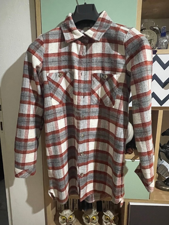 Uzun kollu, düğmeli ve gri-kırmızı ekose desenli, kadınlar için sentetik kumaştan yapılmış, rahat kesim gömlek. Trend sokak stili için uygundur.