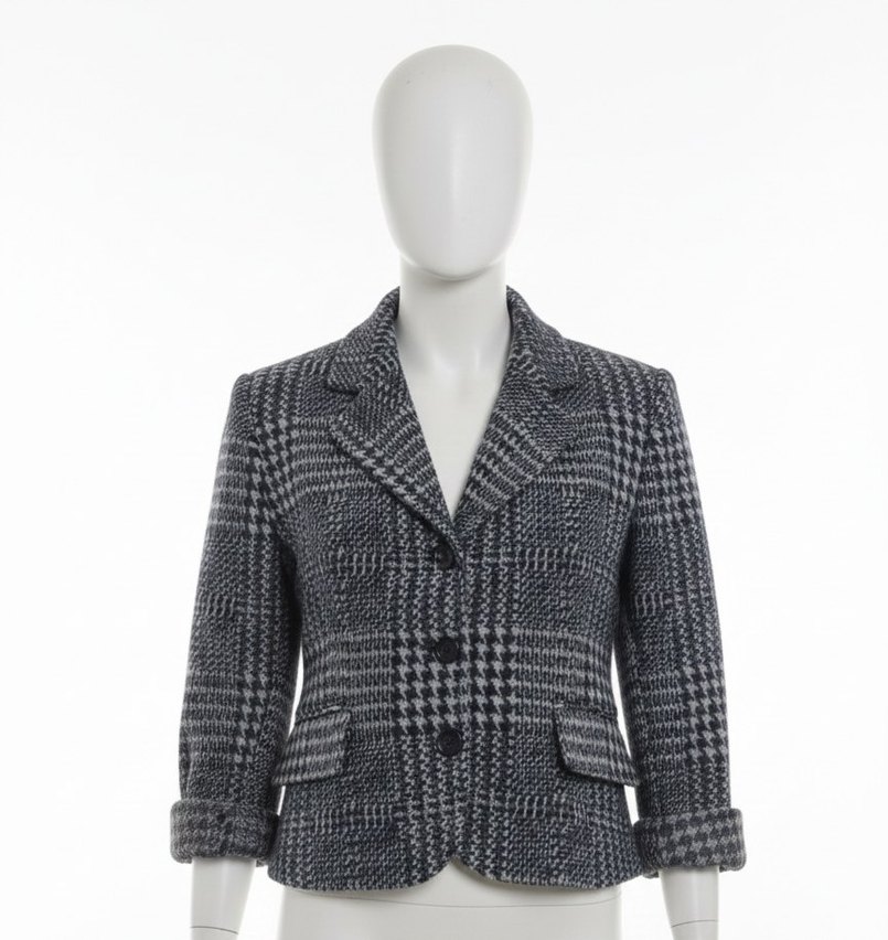 lacivert ekose desenli, yün kumaştan yapılmış, düğmeli, kruvaze yakalı ve uzun kollu kadın blazer. Orta uzunlukta, klasik ofis stiline uygun. joshephıne&co amaterdam markadır. ceplidir.