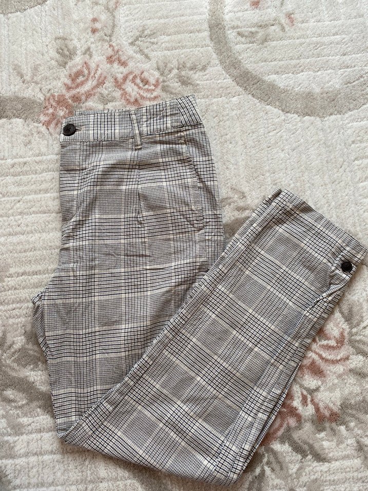 Düğmeli gri ekose desenli, pamuk kumaştan yapılmış, normal kesim kadın kumaş pantolon.
