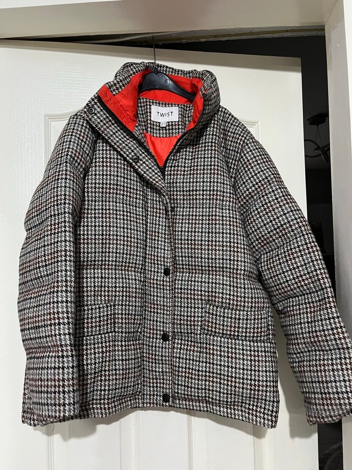 Kadın mont, düğmeli ön ve kesik yakaya sahiptir. Regular fit, uzun kollu ve midi boydadır. Gri ekose desenli sentetik kumaştan, kırmızı iç astarlı ve gündelik kullanıma uygundur. 34-36 beden