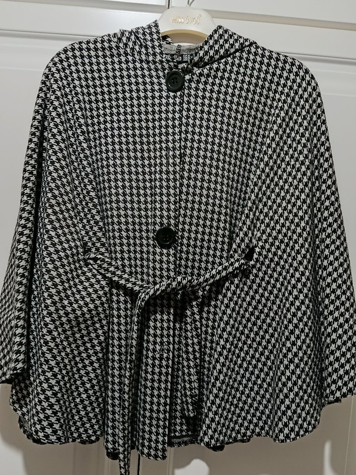 Düğmeli Gri Ekose Kadın Panço
